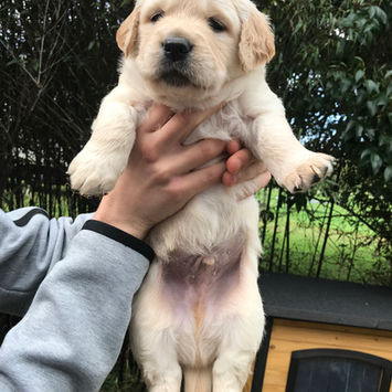 Jazzy is 17 months old and this will be her second litter, she is a character, she is a great mum with a gentle nature and loves cuddling whenever she can. She is very fit and is a darker shade of golden. She is a medium sized leaner golden retriever. Jazz has had a full DNA health profile done and has NO genetic disorders.